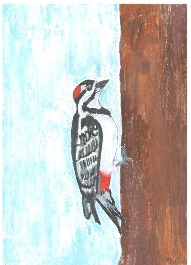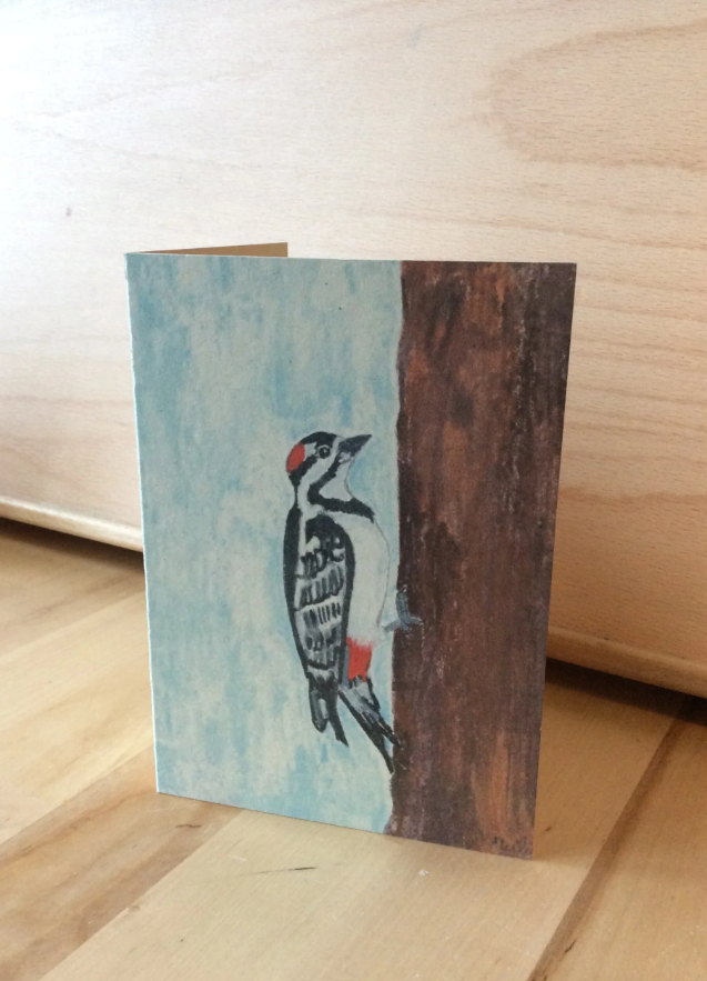 Bij deze kaart met de bonte specht valt een stukje van mijn naam net van de kaart af. Ik vind het zonde om er niets mee te doen, daarom verkoop ik ze voor een lager tarief.